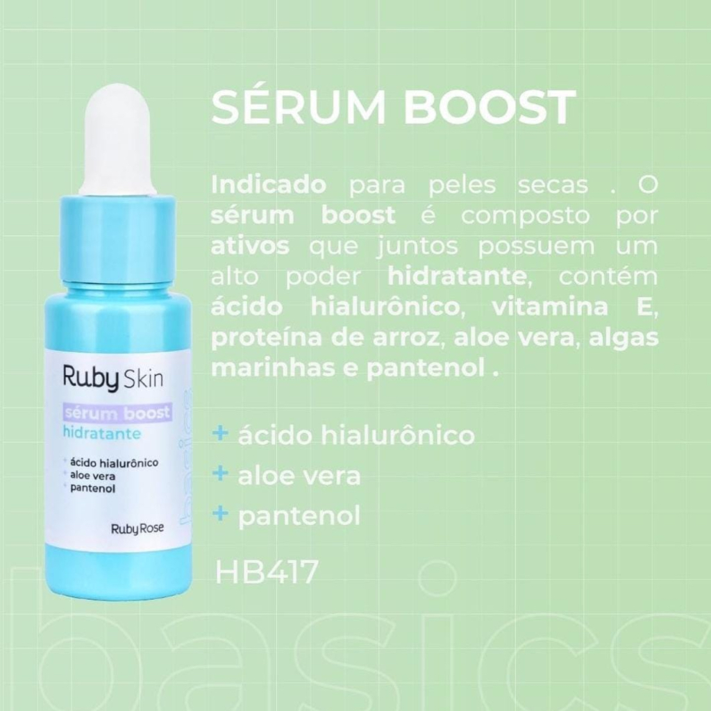 O Sérum Hidratante Boost é composto por poderosos ativos que juntos possuem um alto poder hidratante, contém ácido hialurônico, vitamina E, proteína de arroz, aloe vera, algas marinhas e pantenol. Possui textura suave e de fácil absorção, promovendo uma pele macia e hidratada.